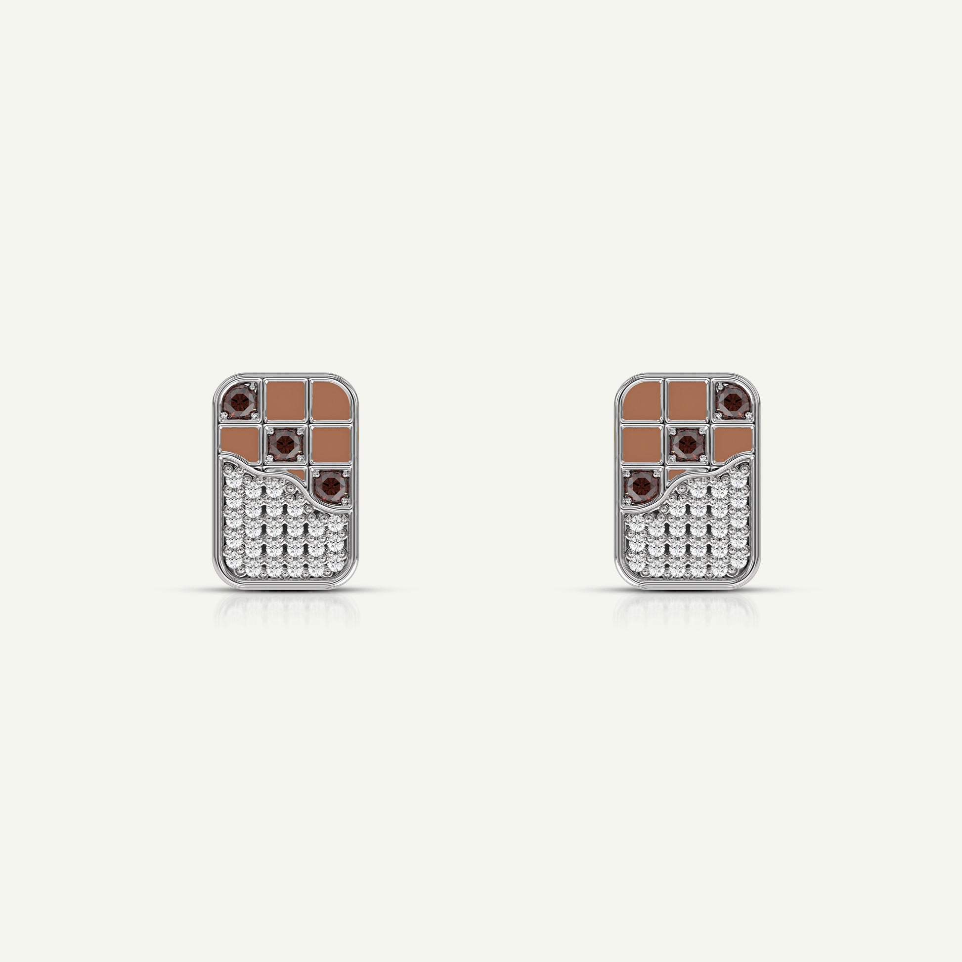 These 92.5 Silver / 14kt white gold earrings look just like tiny chocolate bars! How cool is that? You'll have everyone craving a sweet treat when they see you wearing them. Brown-coloured gemstones resembling chocolate barks and diamonds to add shine, this piece is a must-have for all chocolate lovers!