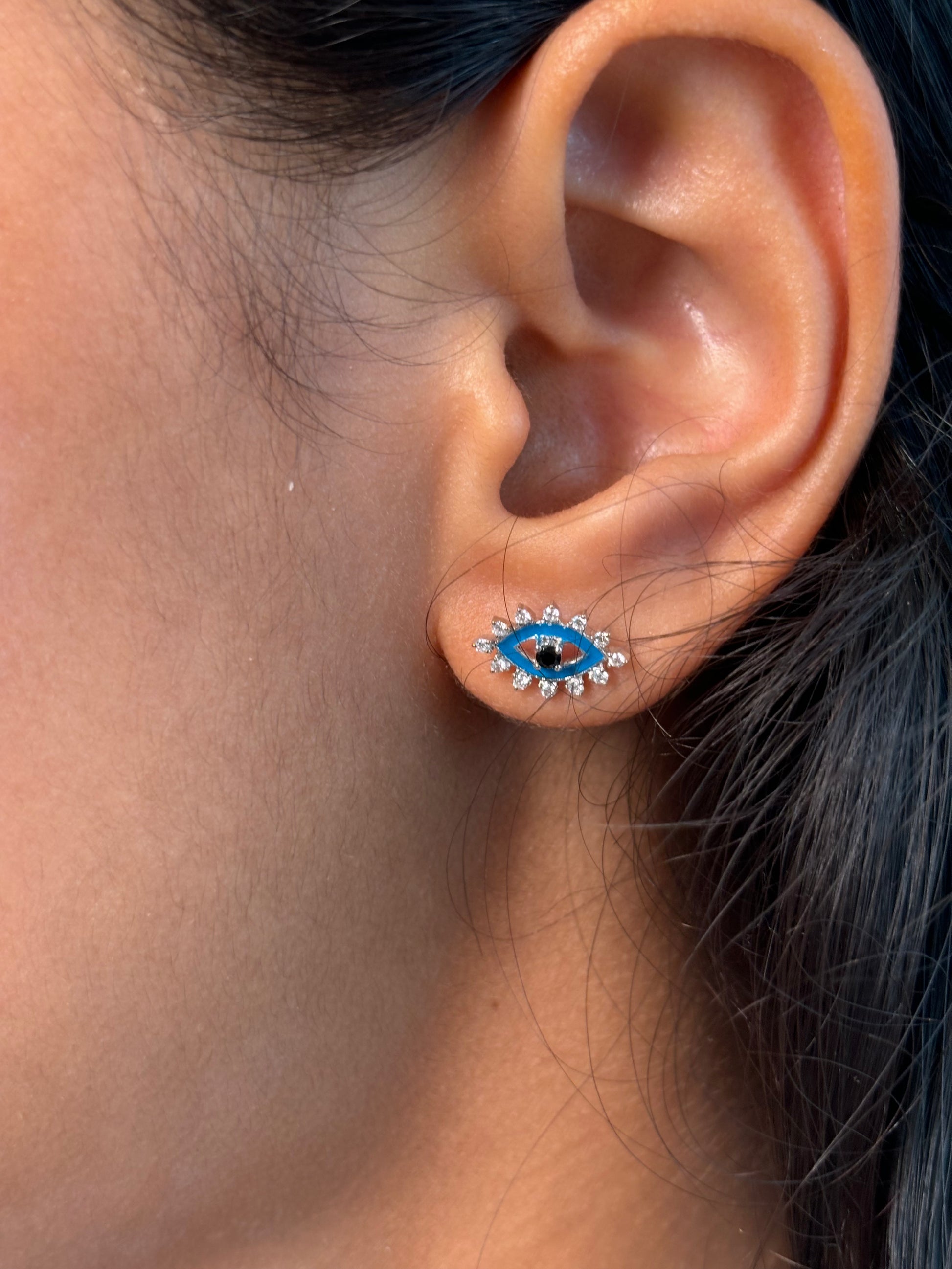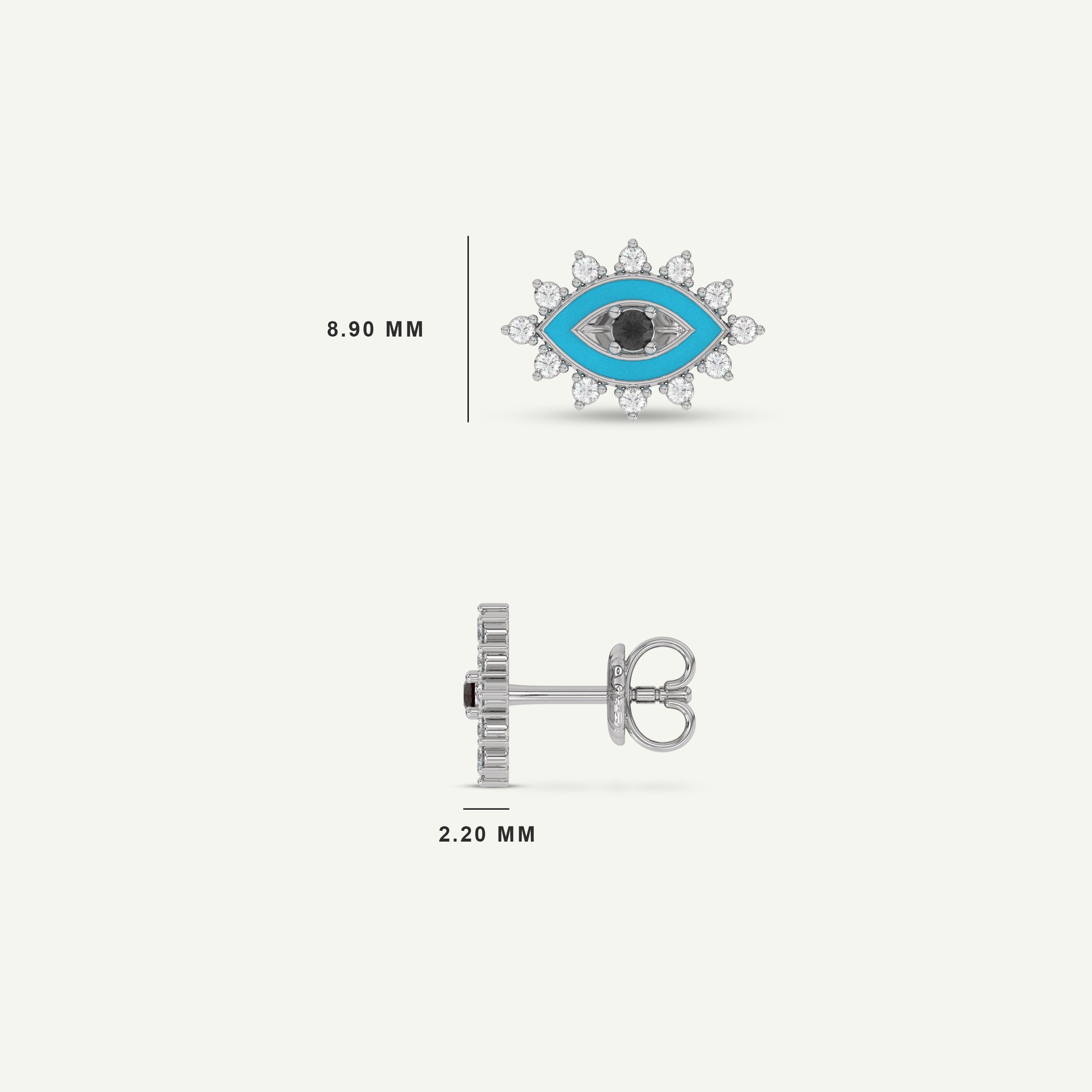 Wear your confidence, and deflect negativity. Nazar, begone, with positivity. These protector earrings are sure to protect you from all evils and the classic eyepiece designed in 92.5 Silver/14kt white gold with enamel & diamonds is suitable for both children & adults. Versatile in its style and elegant in its form, this piece is a must-keep for you and yours.